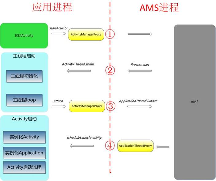 ActivityThread的main入口。在main入口,主线程初始化,并loop起来。主线程初始化,主要是实例化ActivityThread和ApplicationThread,以及MainLooper的创建。ActivityThread和ApplicationThread实例用于与AMS进程通信。 -