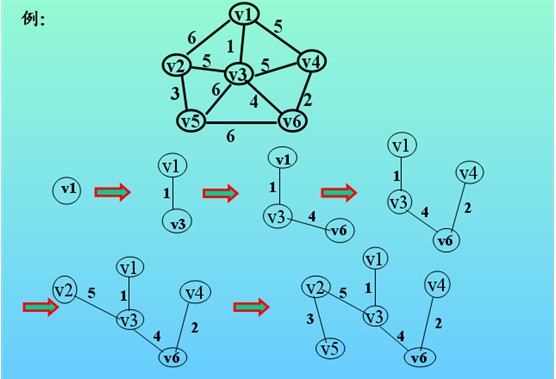 将图G中的边按权值从小到大的顺序依次选取,若选取的边未使生成树T形成回路,则加入TE,否则放弃,知道TE中包含(n-1)条边为止。