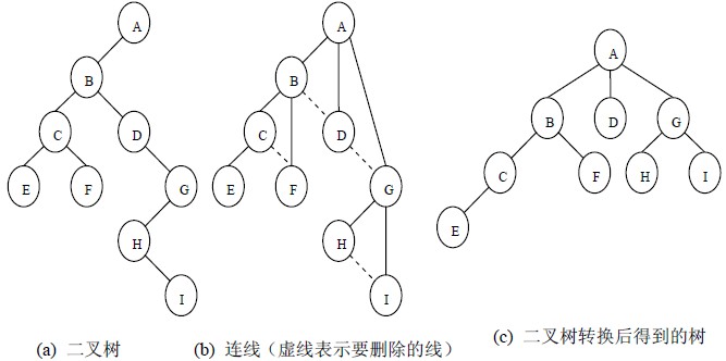 若结点x是双亲y的左孩子,则把x的右孩子,右孩子的右孩子,…,都与y用连线连起来,最后去掉所有双亲到右孩子的连线。