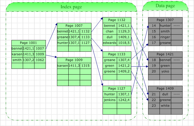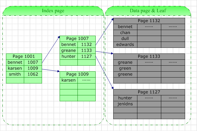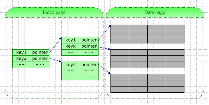 - 类似的,在除叶结点外的其它索引结点,存储的也是类似的内容,只不过它是指向下一级的索引页的。