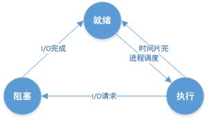 阻塞态:等待某个事件的完成;就绪态:等待系统分配处理器以便运行;执行态:占有处理器正在运行。