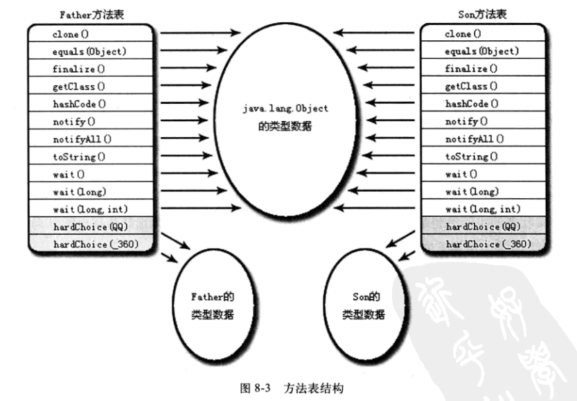 虚方法表中存放各个方法的实际入口地址。如果某个方法在子类没有重写,那么子类的虚方法表里的入口和父类入口一致,如果子类重写了这个方法,那么子类方法表中的地址会被替换为子类实现版本的入口地址。