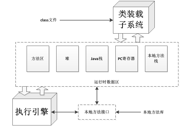 每个Java虚拟机都有一个类装载器子系统,他根据给定的全限定名来装在类型。同样,每个Java虚拟机都有一个执行引擎,它负责执行那些包含在被装载类的方法中的指令。当Java虚拟机运行一个程序时,它需要内存来存储很多东西,例如:字节码,从已装载的class文件中得到的其他信息,程序创建的对象,传递给方法的参数,返回值,局部变量,以及运算的中间结果等等,Java虚拟机把这些东西都组织到几个“运行时数据区”中,以便管理。
