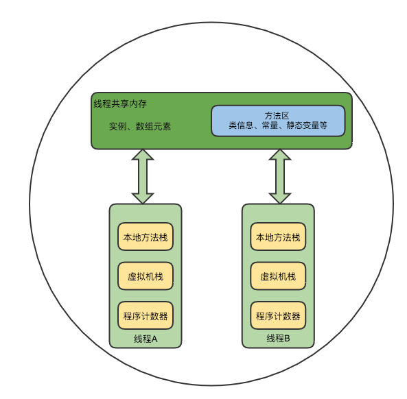 每个Java虚拟机实例都有一个方法区以及一个堆, 他们是由 该虚拟机实例中所有线程共享的。 当虚拟机装载一个class文件时,它会从这个class文件包含的二进制数据中解析类型信息。然后把这些类型信息放到方法区中。 当程序运行的时候,虚拟机会把所有该程序在运行时创建的对象都放到堆中。