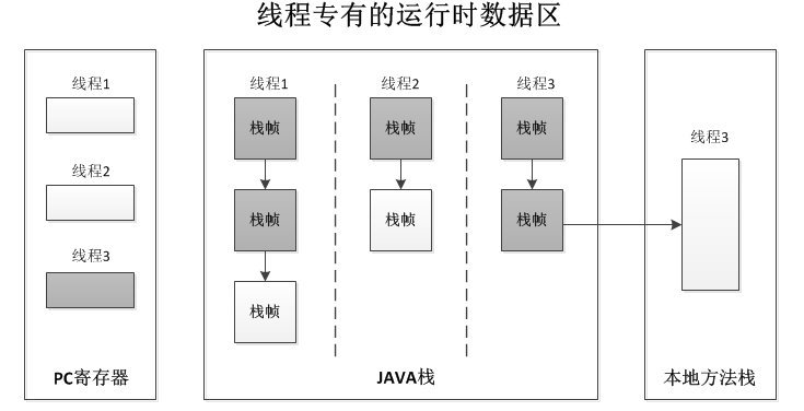 - 图中是一个虚拟机实例的快照,它有三个线程正在执行。线程1和线程2都正在执行Java方法,而线程3在执行Native方法。