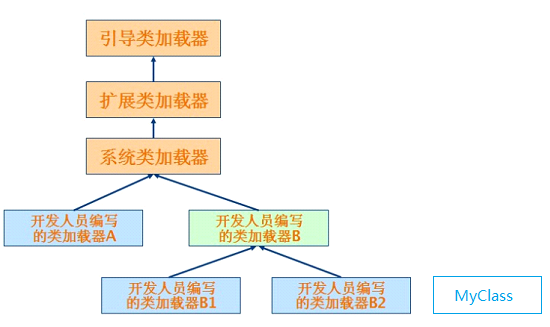 假设 类加载器B2被要求装载类MyClass,在parent delegation模型下,类加载器B2首先请求类加载器B代为装载,类加载器B再请求系统类装载器去装载MyClass,系统类装载器也会继续请求它的Parent扩展类加载器去装载MyClass,以此类推直到引导类装载器。若引导类装载器能成功装载,则将MyClass所对应的Class对象的reference逐层返回到类加载器B2,若引导类装载器不能成功装载,下层的扩展类装载器将尝试装载,并以此类推直到类装载器B2如果也不能成功装载,则装载失败。